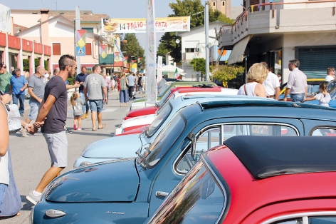 Numerose FIAT 500 d'epoca e nuove, fanno da cornice al mercatino. I vari modelli sono a disposizione del pubblico per foto e per un breve tragitto.